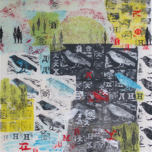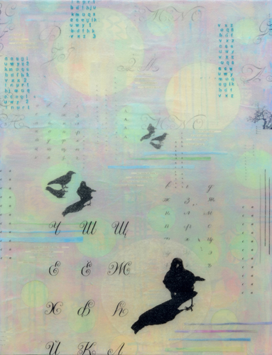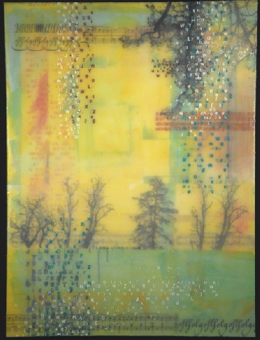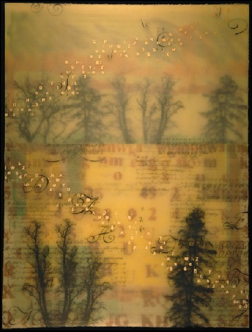 Letters, numbers, math equations and such are used abstractly, serving as value, texture, pattern and spatial indicators. Trees, birds, circles, and other images are also symbols. Actual space and the illusion of space are explored; created and thwarted. Viewers successfully combine the disparate imagery and find meaning in the gestalt of the combination.