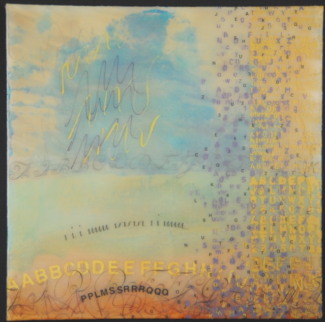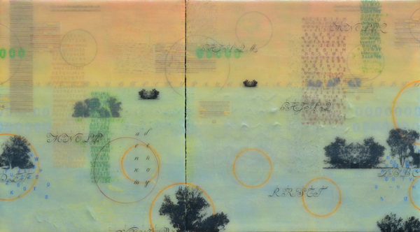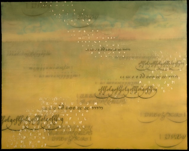 Most of Debi Pendell’s recent works are investigations of semiotics, language, and meaning based in the format of landscape painting. Concentrating on abstract elements of recognizable shapes and characters in combination with materials and processes, Pendell plays with symbols of both visual art and language and how people “read” them and make meaning from them.